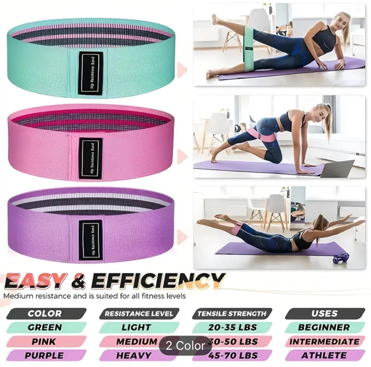 Bandas de Resistencia de Tela: Tres niveles de intensidad (Ligero, Medio, Pesado) en colores pastel, diseñadas para no deslizarse ni enrollarse durante el uso.